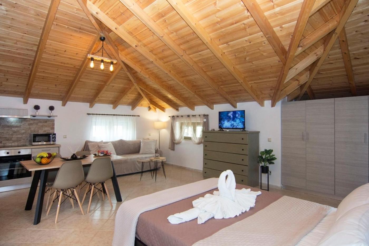 The spacious apartment includes a fully equipped kitchenette with an oven and a fridge, as well as a coffee machine. The unit is air conditioned and is comprised of a terrace with an outdoor dining area as well as a flat-screen TV with streaming services. For added privacy, the accommodation features a private entrance.