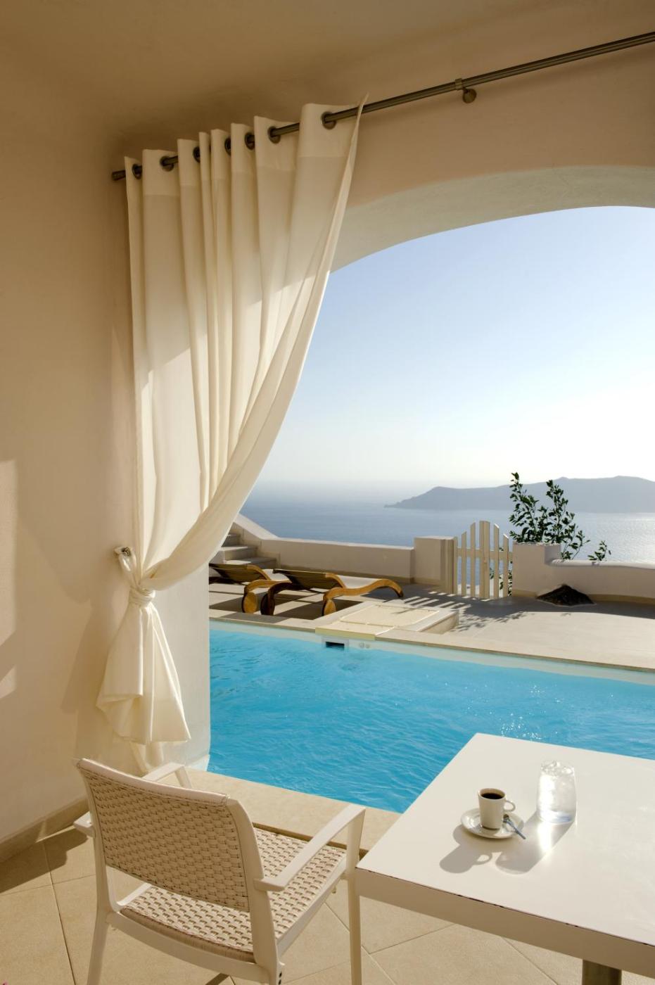 Deluxe Suite with Private Heated Pool and Caldera View. Spacious suite offering a large veranda with a private heated pool, loungers, and dining area with views to the caldera. It includes an open-plan bedroom with king-size bed and living room. ;