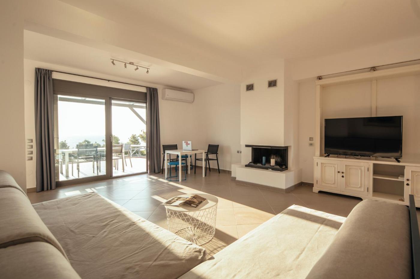 One-Bedroom Apartment. The fireplace is a top feature of this apartment. Boasting a private entrance, this air-conditioned apartment comes with 1 living room, 1 separate bedroom and 1 bathroom with a walk-in shower and a hairdryer. Guests will find a stovetop, a refrigerator, kitchenware and an oven in the fully equipped kitchen. The apartment also includes a barbecue. Featuring a balcony with sea views, this apartment also features a tea and coffee maker and a flat-screen TV with streaming services. The unit has 3 beds.