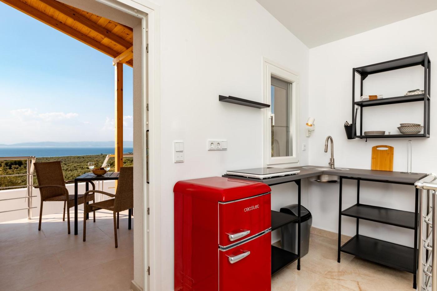 Two-Bedroom Apartment with Sea View. Guests will have a special experience as the apartment offers a pool with a view. This apartment consists of 1 bedroom, kitchenette, a terrace and 1 bathroom with a shower. The apartments kitchenette, which features a stovetop and a refrigerator, is available for cooking and storing food. The air-conditioned apartment provides a flat-screen TV, soundproof walls, a wardrobe, a tiled floor as well as sea views. The unit offers 3 beds. ;